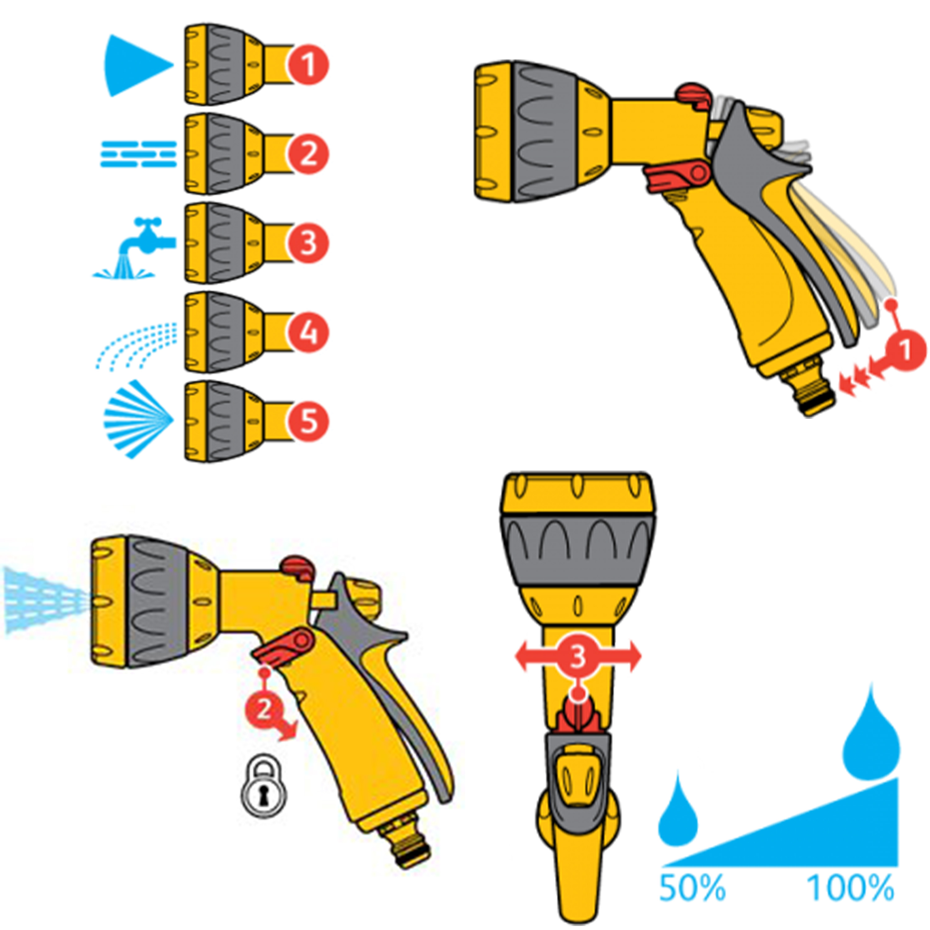 Five spray patterns (1) Cone for delicate watering (2) Powerful jet for cleaning (3) Fast Fill for filling buckets and watering cans (4) Fine Rose for gently watering seedlings (5) Flat for rinsing soap off cars